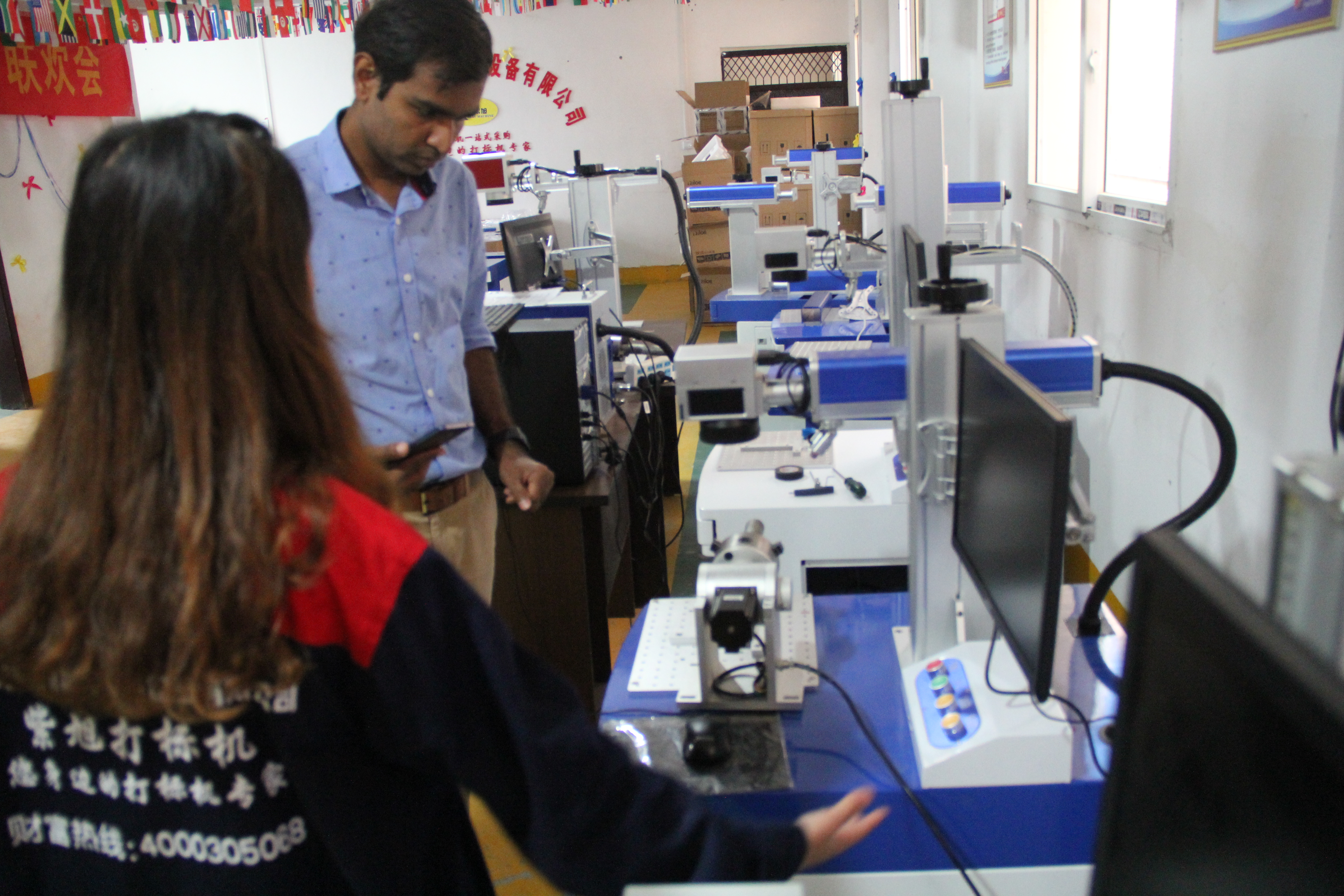 沙特阿拉伯打標(biāo)機(jī)客戶來(lái)訪定做流水線開(kāi)關(guān)面板激光打標(biāo)機(jī)